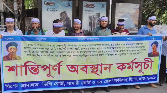 পিলখানা হত্যাকাণ্ডে চাকরিচ্যুত বিডিআর সদস্যদের ক্ষতিপূরণসহ চাকরিতে পুনর্বহালের দাবিতে অবস্থান নিয়েছে চাকরিচ্যুত বিডিআর সদস্য ও তাদের পরিবার।